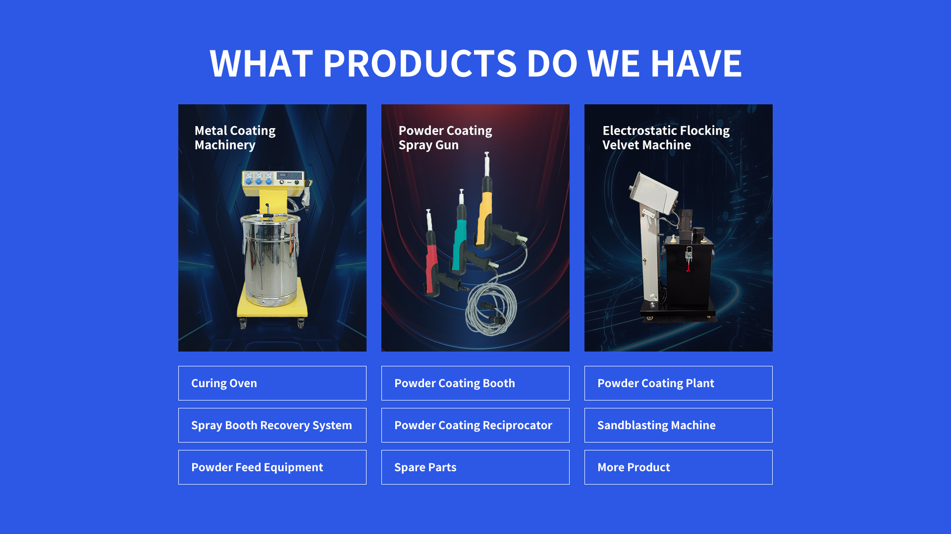 A Powder Coating Machine applies electrostatic powder to surfaces and cures them into durable finishes. Core components include an electrostatic spray gun, powder hopper, high-voltage generator, control panel, and curing oven.